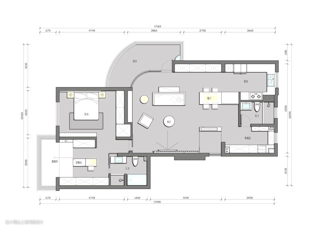 本案为三房二厅二卫一厨,室内使用面积在125个平方,常住人员一对年轻夫妻。 希望整体空间通透,生活区可以比较宽敞方便家人的互动用餐,空调地暖新风都需要。厨房希望做敞开式处理,阳台作为景观休闲设计。