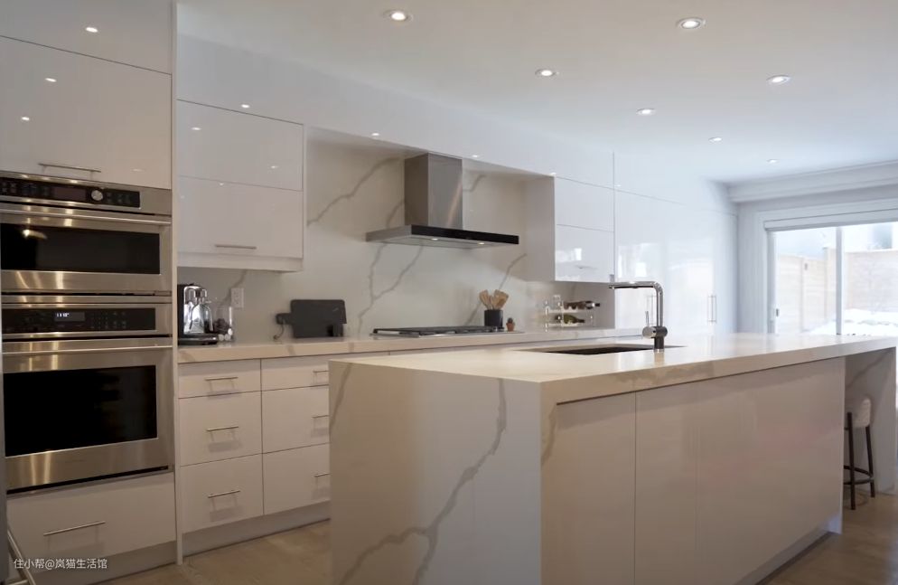 厨房做的岛台一体化设计,厨房整个空间看起来以白色为主,嵌入的金属色家电为房间增添了一份跳色,岛台的设计让整个厨房更加大气。