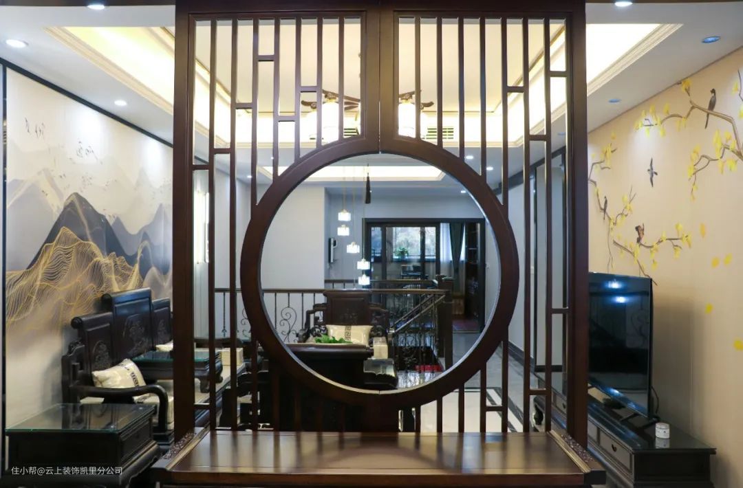 ▲ 设计师选用栅栏隔断,组合充满中式感觉的圆形造型出现,奠定了新中式家居禅意美的基调。
