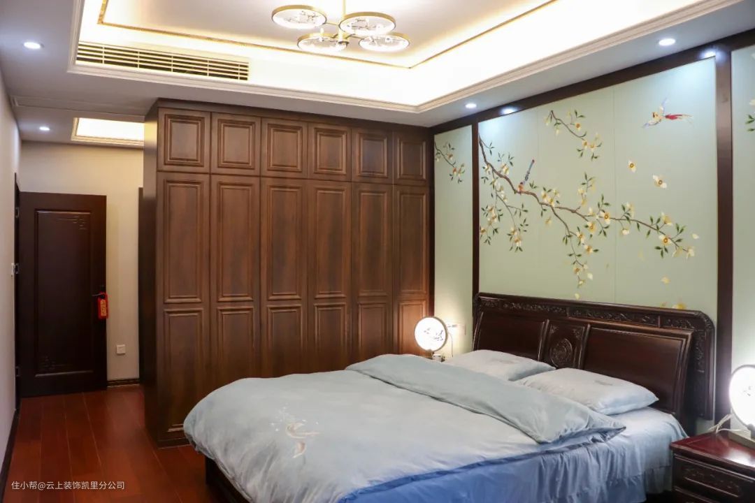▲ 主卧房虽然很多“木色”元素,但并不老气横秋,卧室背景墙的一抹靛蓝点亮空间,精致淡雅。