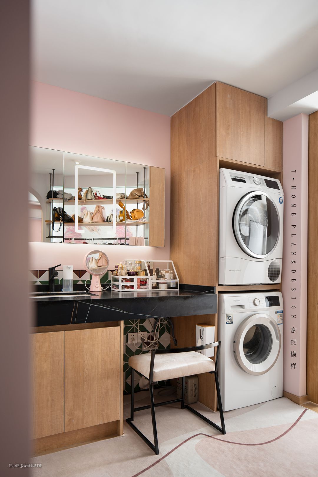 浴室柜区域一共整合了三个功能区域(浴室柜、梳妆台、洗衣区)🥰🥰 浴室柜+梳妆台1.5m,超大台面使用,小姐姐的梳妆用品、首饰盒可以完全放下。 洗衣区将阳台的洗衣机、烘干机整合到了卫生间门口的干区,清洗衣物很方便。 真正达到了空间的重复利用~ tips:烘干机很好用,再也不担心衣服晾干会皱了。