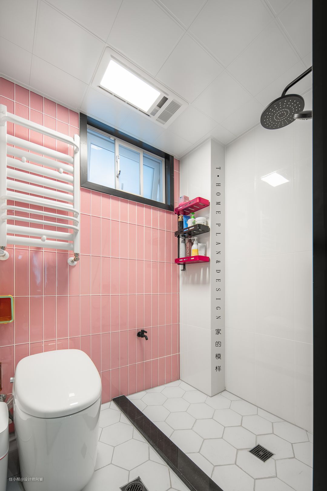卫生间颜色采用粉色+白色为主,地面用六角砖铺设。视觉干净利落,感受温馨舒适!! tips:彩色琉璃砖通透的质感真的很好,但一定注意窗台和转角处需要窗套收口或者使用收口条,不能现场加工碰角哦