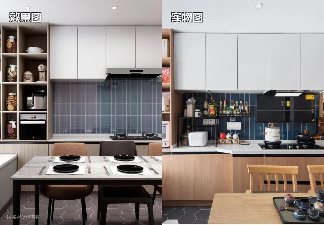 厨房区域;效果图VS实景图 墙面铺设蓝色玻璃砖+方太烟灶。 白色吊柜+木色地柜,层次鲜明。