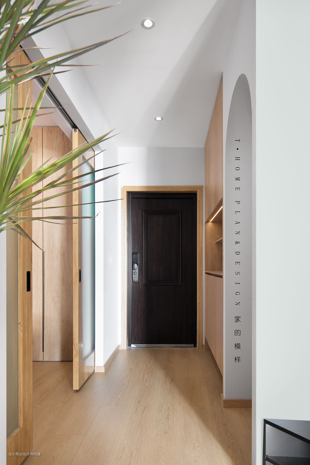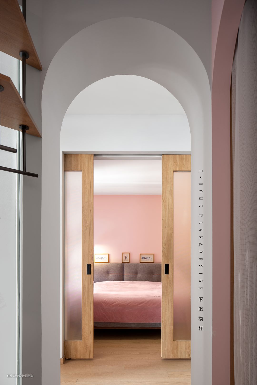 圆拱形门洞,半通透的木质玻璃门,创造了很好的视觉延伸感。✅ 拱形门洞左侧是开放式衣帽间,右侧为储藏间。整体功能区域共享。⭕ Tips:木质门框配水晶方格纹玻璃很小众,很好看,还有胡桃木配海棠玻璃也可以mark一下🤟