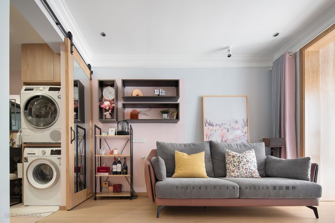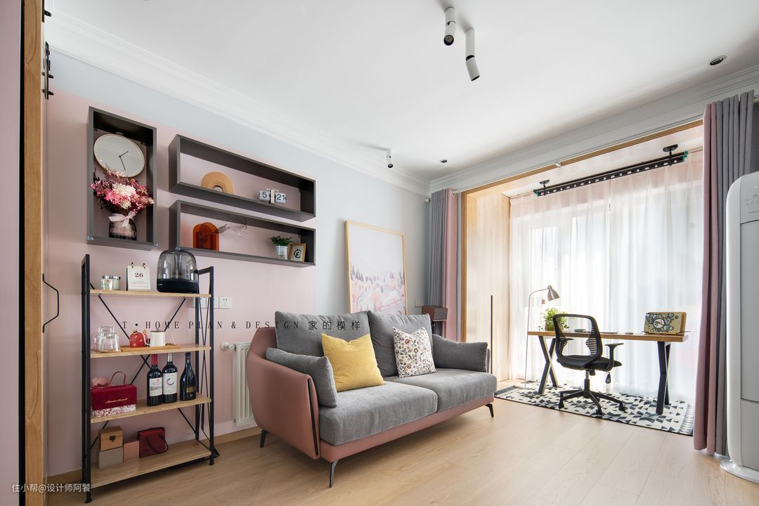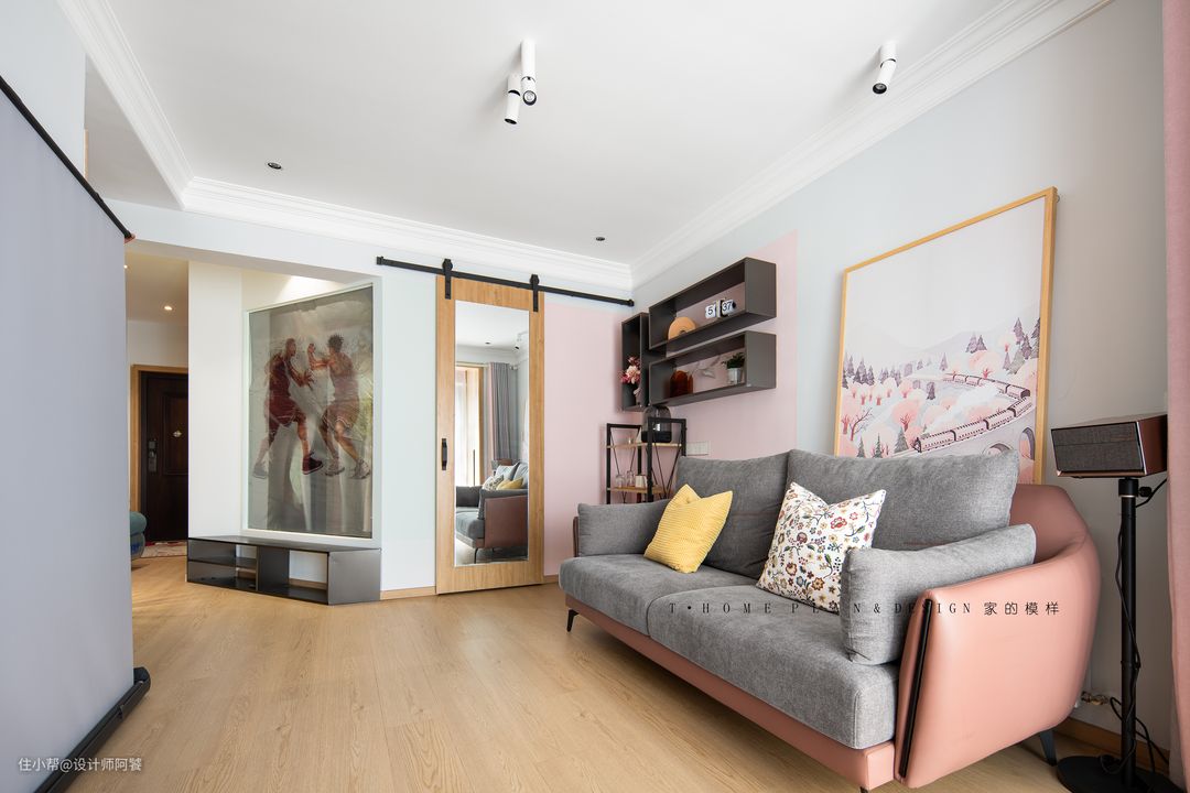 🤸♀️大双人位沙发足够窝在上面犯个懒; 🎨背景墙大面积灰色和粉色的搭配,局部配饰用一点深色,整体并不会显得粉色稚嫩,而是多透露出一些温柔与活力。