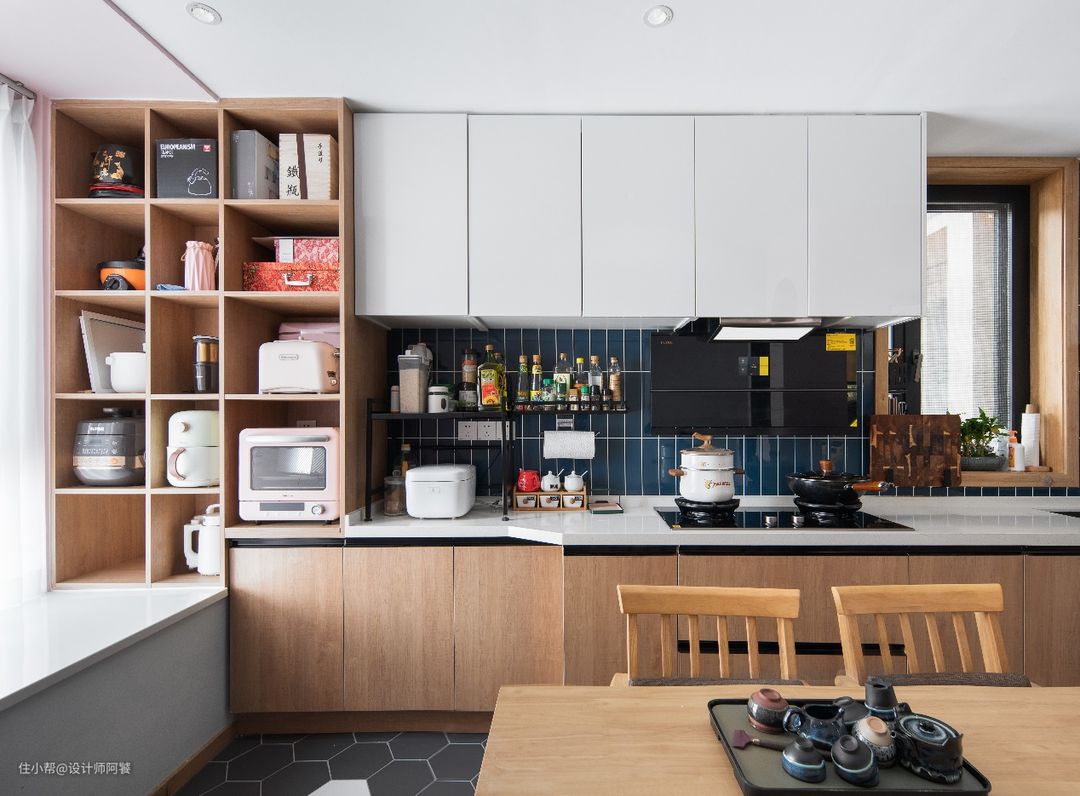 厨房各类小家电应有尽有,还好收纳空间足够,原木色配白色超级nice Tips:小姐姐们,尽量少做开放格,尤其是窗边,除非家里有位免费劳动力 还是有很多小伙伴会问我,餐厨一体,油烟真的可以避免掉吗? 那下面我来揭晓本次厨房改造的秘诀~ 本案厨房的厨电使用的是方太X1S+JEM7A烟灶组合;X1S油烟机是极简风格设计,12cm纤薄机身,不遮挡视线,为餐厨一体空间增加了一抹别致的风景~ 低吸上排,变频电机强力加压,烹饪油烟全都吸光光~客户实际现场检验烟机噪音时,吸入风量高达24.5m³/min,整体没什么噪音,在烹、炒、炸中,静享烹饪。 挥手就可以控制油烟机开关——是女主人最喜欢的细节之一,手上有油的时候可以享受零触碰开机,不用担心弄脏面板。 业主是对美食烹饪很讲究的一个美食家,对食材的火候掌握至关重要,方太JEM7A灶具能提供最大5.2kw的大火力,底部的隔热聚能罩为极火加持,燃气燃烧更充分,有75%的高热效率,爆炒轻松hold。这款灶具还能调节大小火,小火也很稳定。易清洁的涂层,使用完更易清洁,摆脱油污困扰。 方太真的是每一个细节都致敬匠心。有方太为烹饪保驾护航,再也不用为下厨发愁啦 ~”