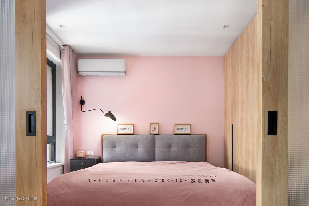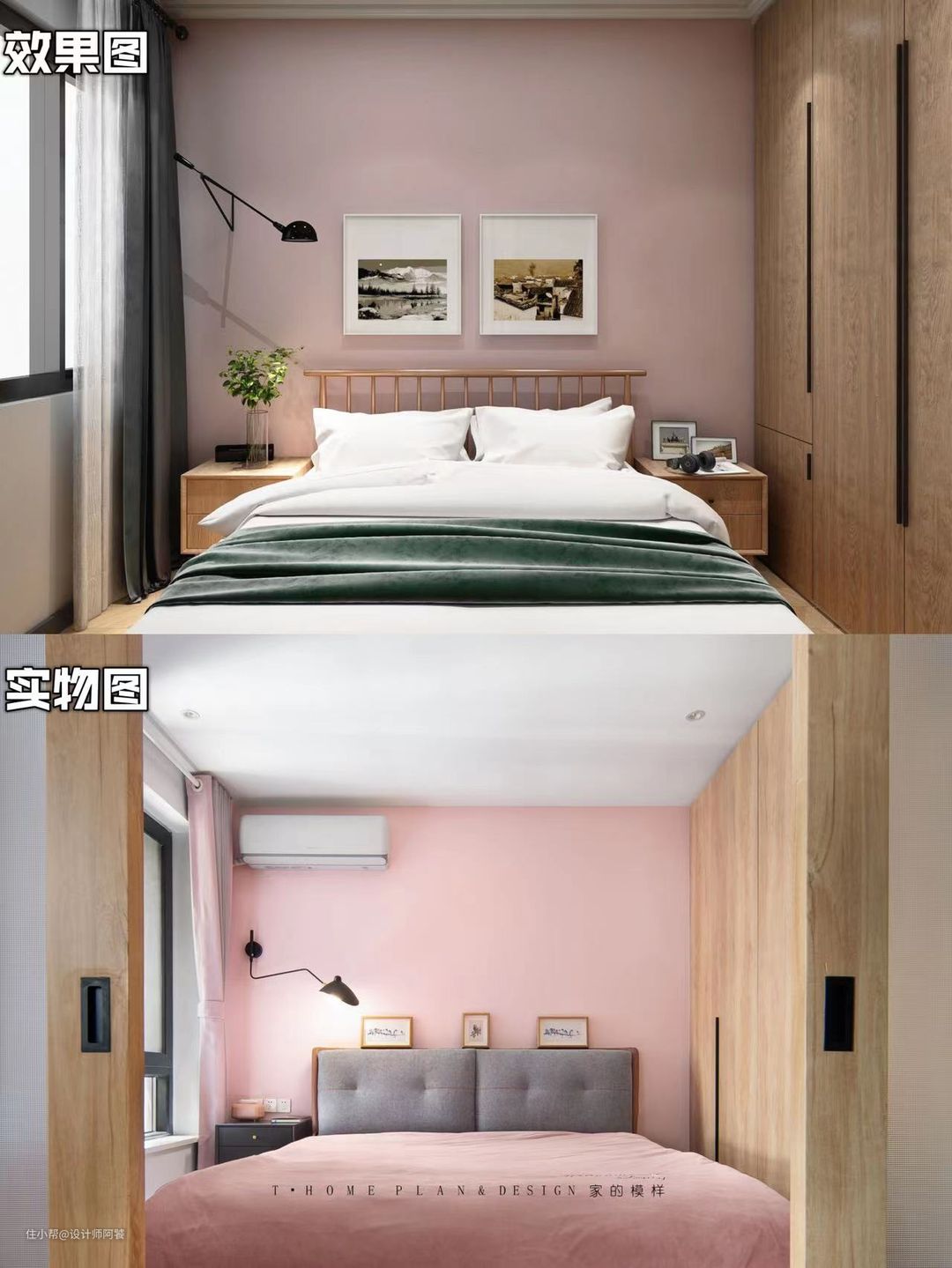主卧区域;效果图VS实景图 女主人特别喜欢粉色,床头粉色乳胶漆调色。 原木色衣柜,一门到顶柜门板,更加极简。
