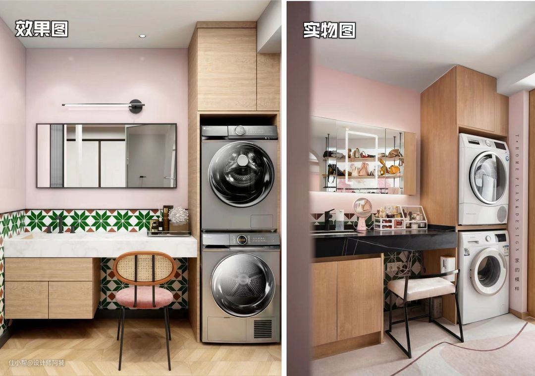 干区浴室柜区域;效果图VS实景图 墙面铺设花砖+卫浴漆。 1.5m超长浴室柜更加实用,洗衣机+烘干机更加方便