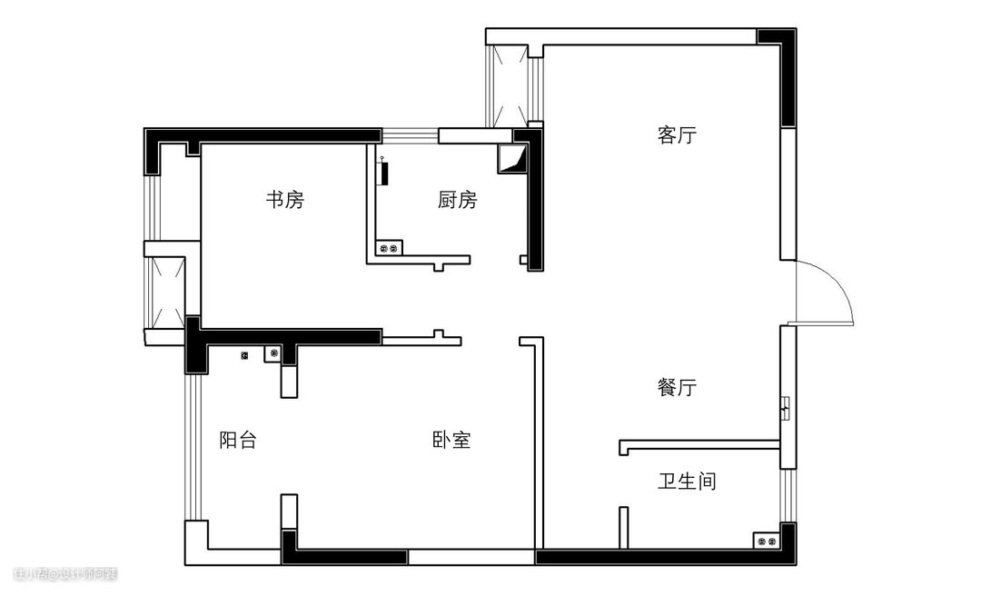 💡 原始空间分析 ⭐客厅:采光面仅有一扇窗,而且窗外是天井,光线昏暗,通风差; 🍕餐厅:处于墙角,无窗,空间无法满足业主小姐姐家里经常聚会的需求,紧挨卫生间,严重影响就餐体验感; 🛀卫生间:原卫生间空间较规整,能做三分离,但无法满足梳妆台及生活起居物品收纳的需求; 🧡卧室:空间规整,通风采光较好,全屋的CBD地区; 🌞阳台:做为生活阳台满足需求,视野极好,小姐姐希望能在阳台办公、看书、练瑜伽; 🍳厨房:窗外是天井,光线极差,空间狭小,完全无法满足一个厨房重度依赖者; 🔖书房:窗户朝南,空间较为舒适,但小姐姐是独居,不想单独一个空间做书房使用。