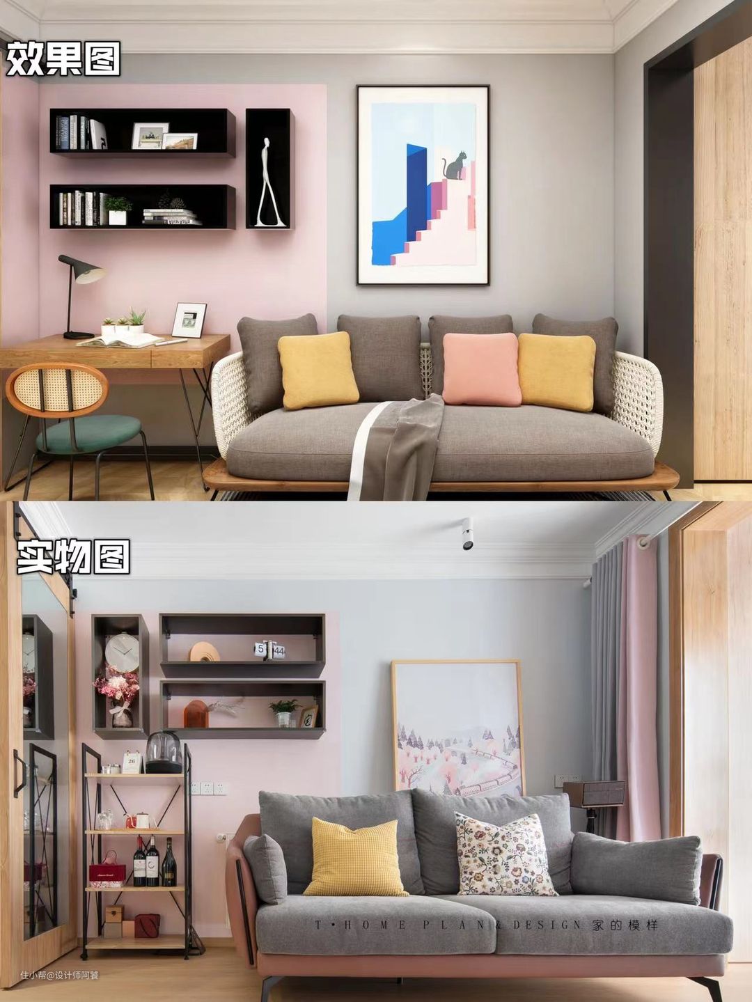 客厅区域;效果图VS实景图 “蓝粉组合” 乳胶漆颜色;整体色彩协调 定制不锈钢吊柜增加客厅质感。