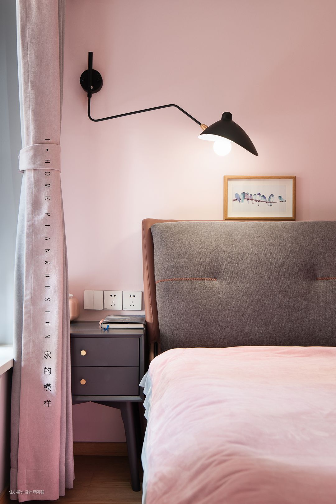 灰色布艺床头+粉色背景,颜色比较搭配毫无违和感💙 橡皮粉配黑色真是绝配🦆 Tips:阅读灯安装高度1.6m,固定式阅读灯高度1m较合适。