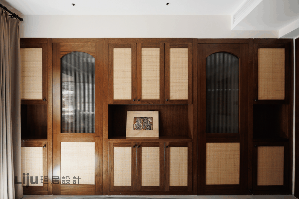 墙柜靠近阳台的一侧,设计师用开放格+拱形座位的形式为屋主创造出一个小小的阅读角,在打破过于规整造型的同时也让南洋风在客厅有了展现。