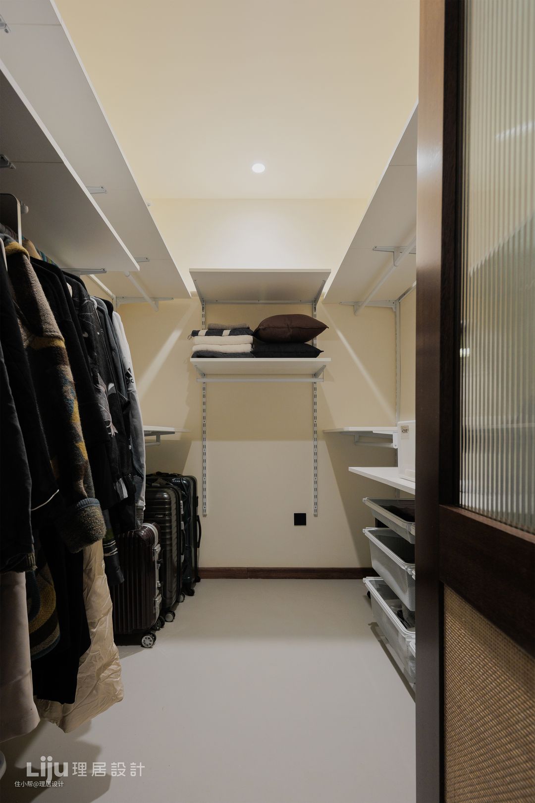 床对面的一组柜子中暗藏着卫生间与衣帽间的入口,右侧靠近门口的是衣帽间,打开后开放式的储物系统让容量最大化的同时也方便取物。