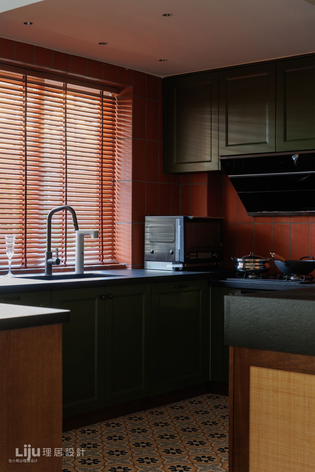 厨房位于靠近窗台的位置,暗红色的闽南红砖带着粗砺的手工质感,与黑色操作台面搭配出具有年代感的气息。洗碗池设置在窗下便于通风,下厨时也可以看到窗外的风景。