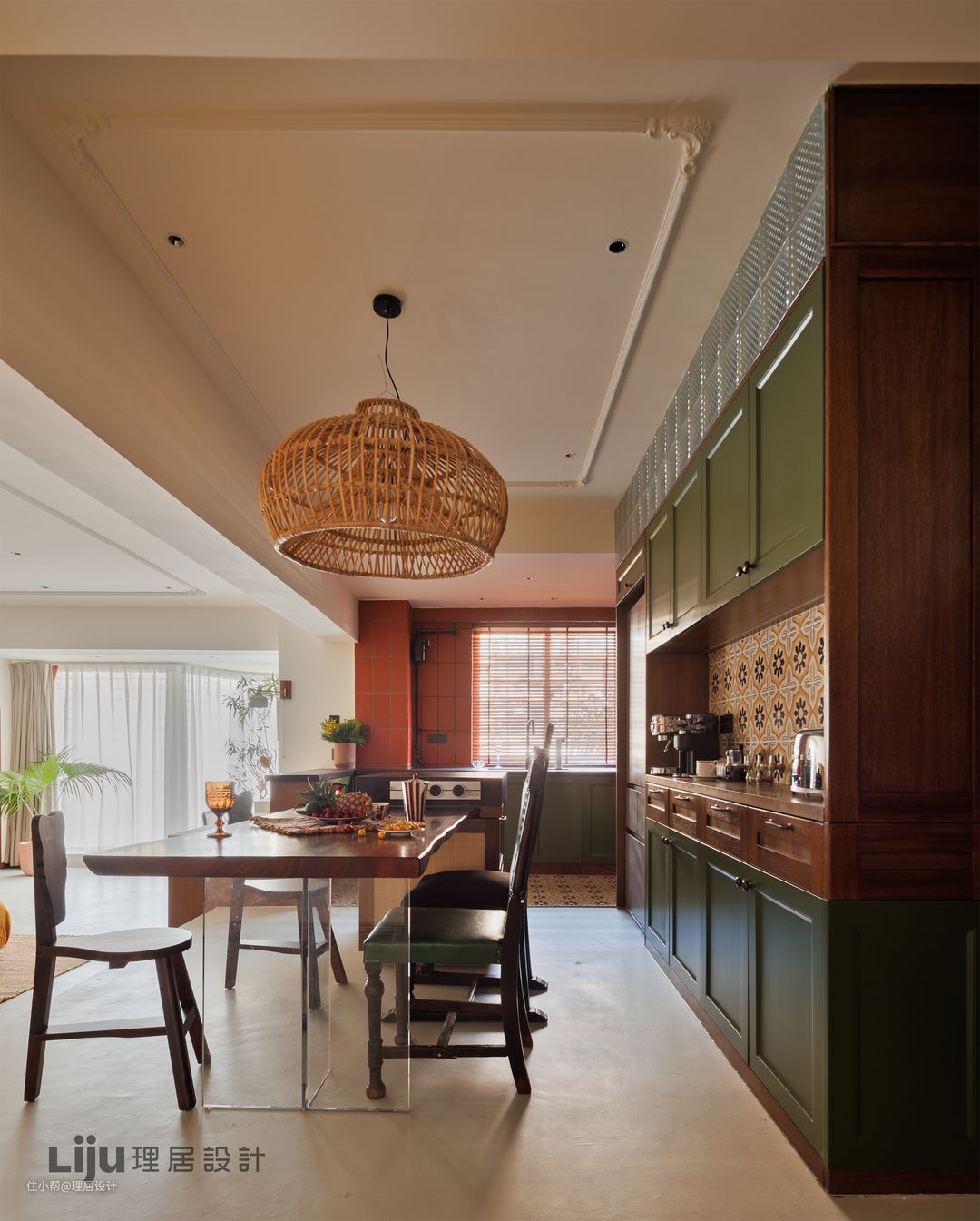 岛台一侧嵌入了一块原木大板作为桌面,搭配亚克力材质桌腿让整体更加轻盈通透。后方的餐边柜是屋主日常制作咖啡的区域,随手拿取放置物品都十分方便。