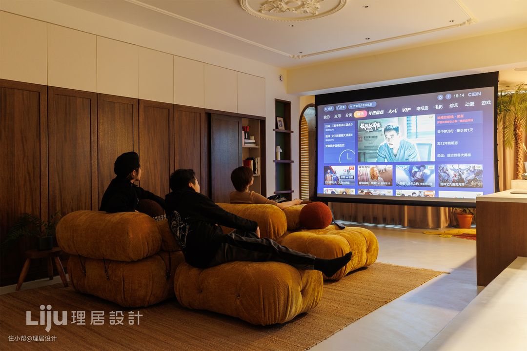 在靠近阳台一侧的天花横梁中隐藏着投影幕布,拉上窗帘或者晚上的时间,客厅瞬间变成观影体验绝佳的私人影院。