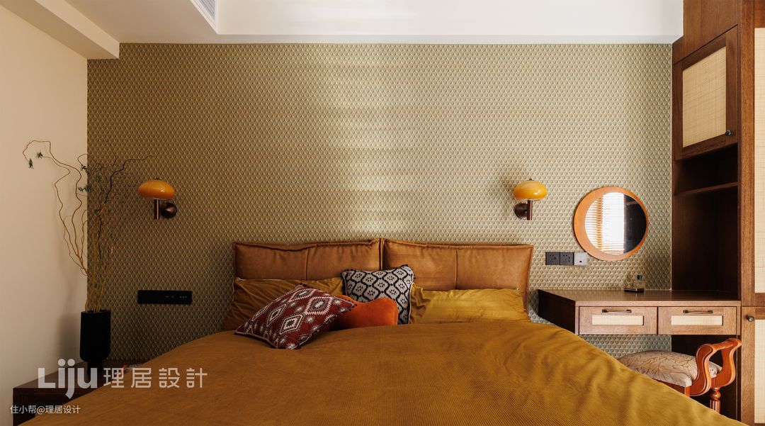 低重心的软包床一侧是同样低矮的床头柜,适合放置一些较高的花瓶与植物;另一侧则是女主人的梳妆台,也可以作为临时书桌使用。