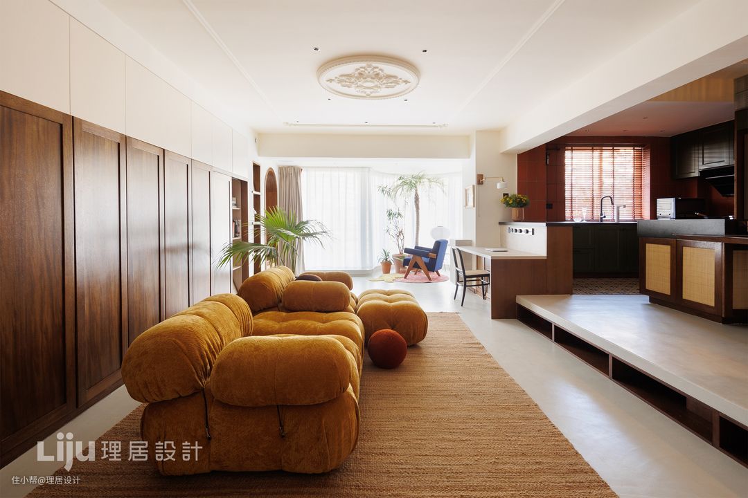放置在客厅中间的姜黄色沙发可以根据座位的方向自由拆分组合,方便家人在各个方位进行交流。 沙发背景的一整面柜子是整个公区的收纳主力,木色与米色柜门的高度比例对应餐厨空间的高度,在视觉上达到平衡。