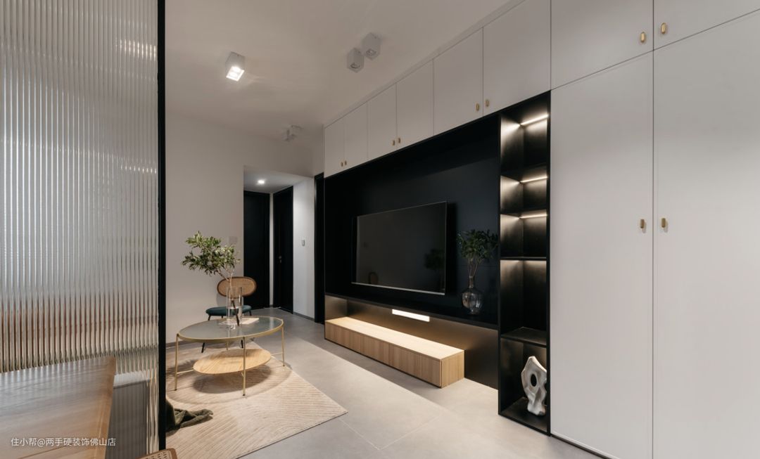 电视背景墙是一整排的储物柜,中间嵌入黑色,木色电视柜点缀,一方面是为了丰富视觉层次,另一方面是和厨房的黑色电器高柜以及一门到顶的卧室门形成呼应,让整个空间更加完整统一。