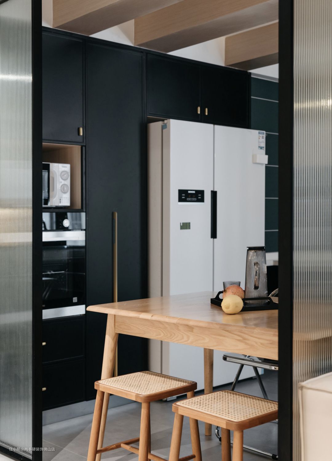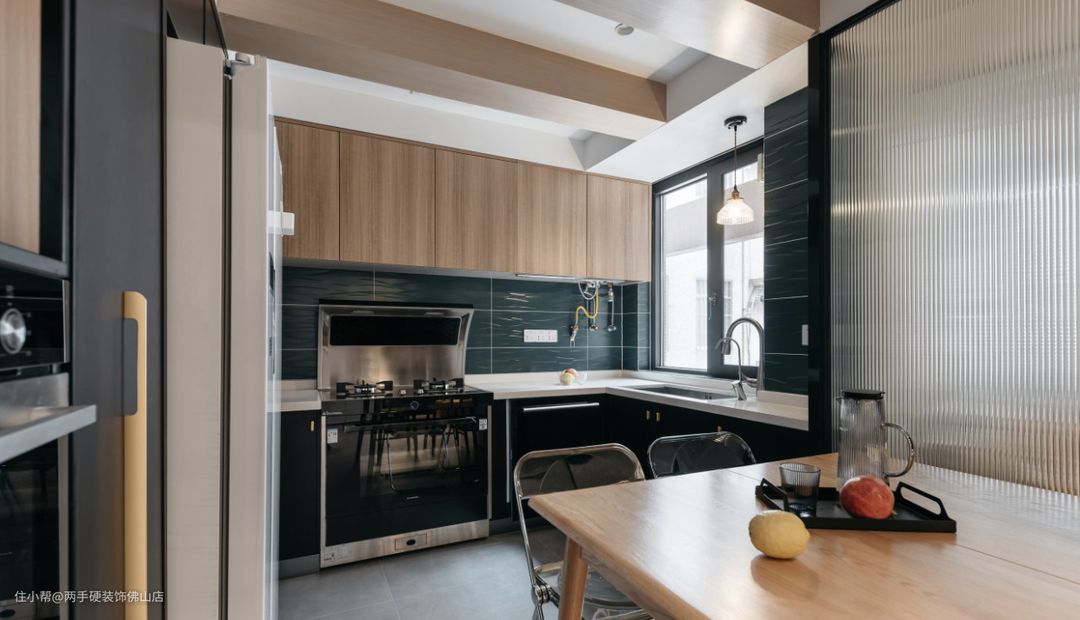 原木吊柜与餐桌色彩呼应,纯黑色地柜加黄铜小拉手提亮点缀,搭配墨绿色墙砖,简约中带点复古调。 颜值与实用并存的的餐厨一体设计,在普通炉灶和集成灶之间选择了集成灶,节约吊柜内部空间,尽可能的实现储物最大化。