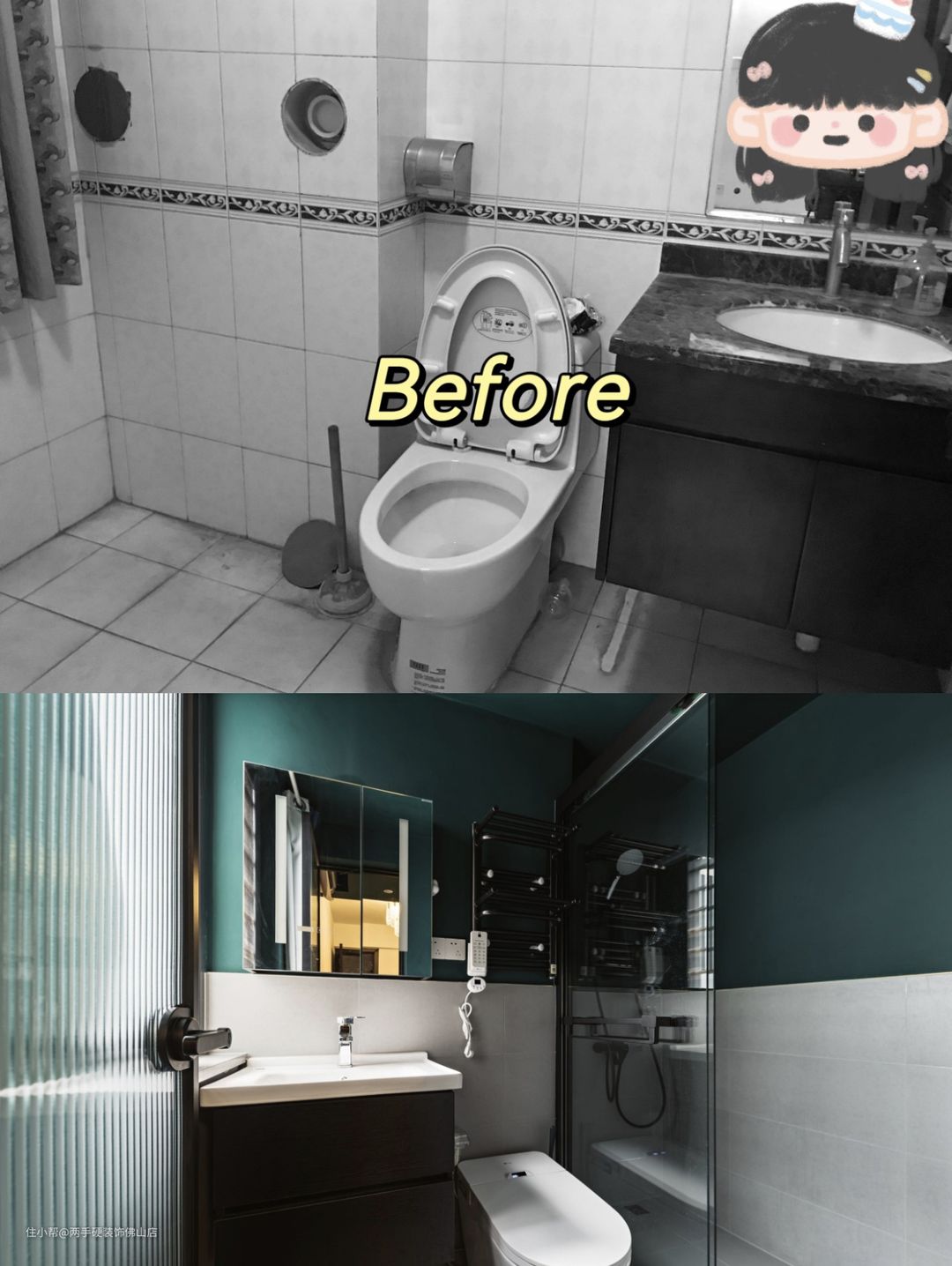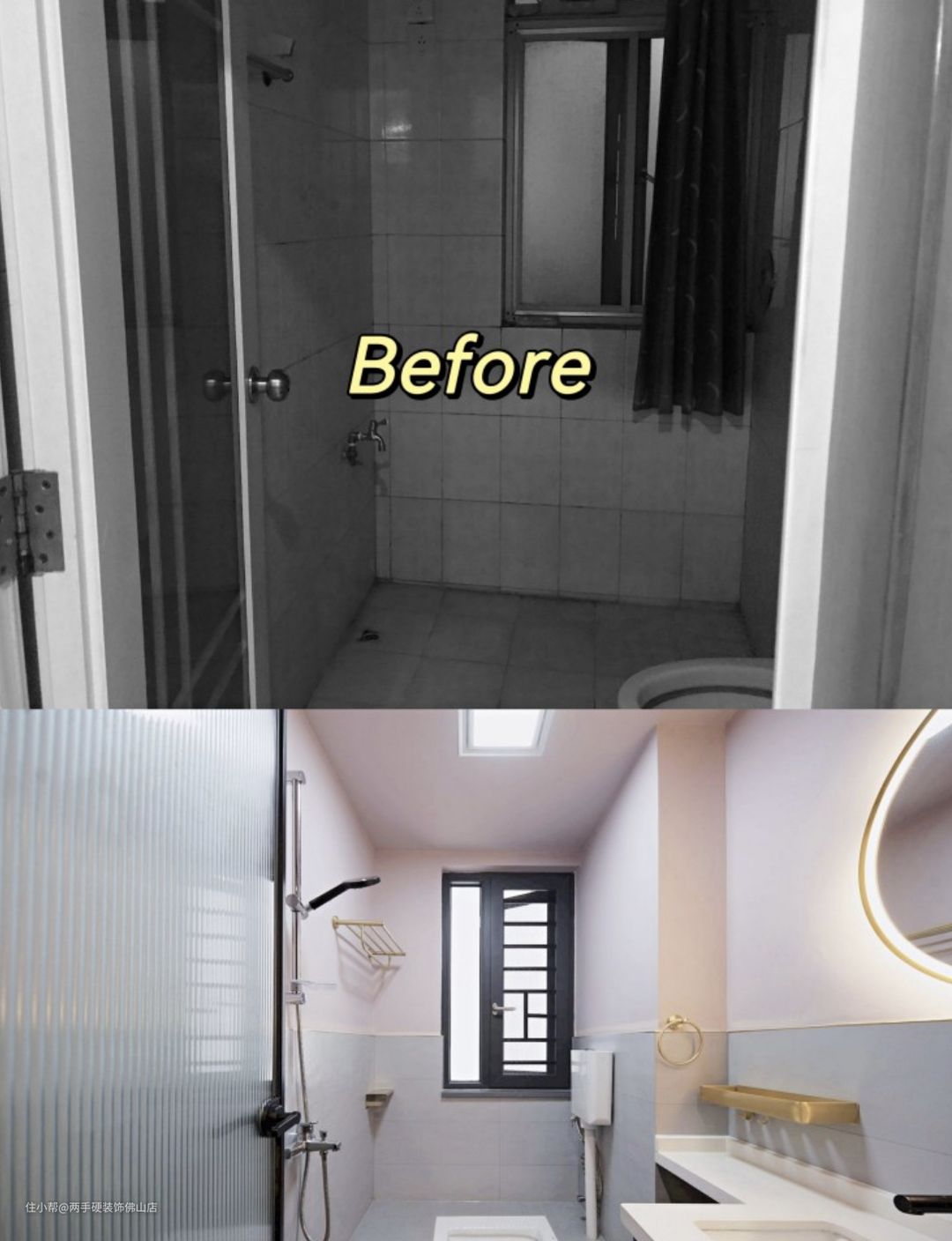 #公共卫生间 客卫根据客户未来居住家庭成员使用习惯需求采用的是蹲厕,原卫生间没有沉箱蹲厕位置进行了抬高。因空间比较小没有设置单独淋浴房,墙面采用半墙铺贴瓷砖工艺,上半部分涂刷防水漆