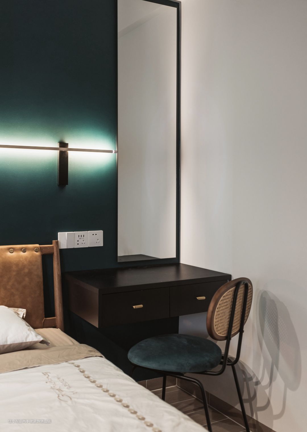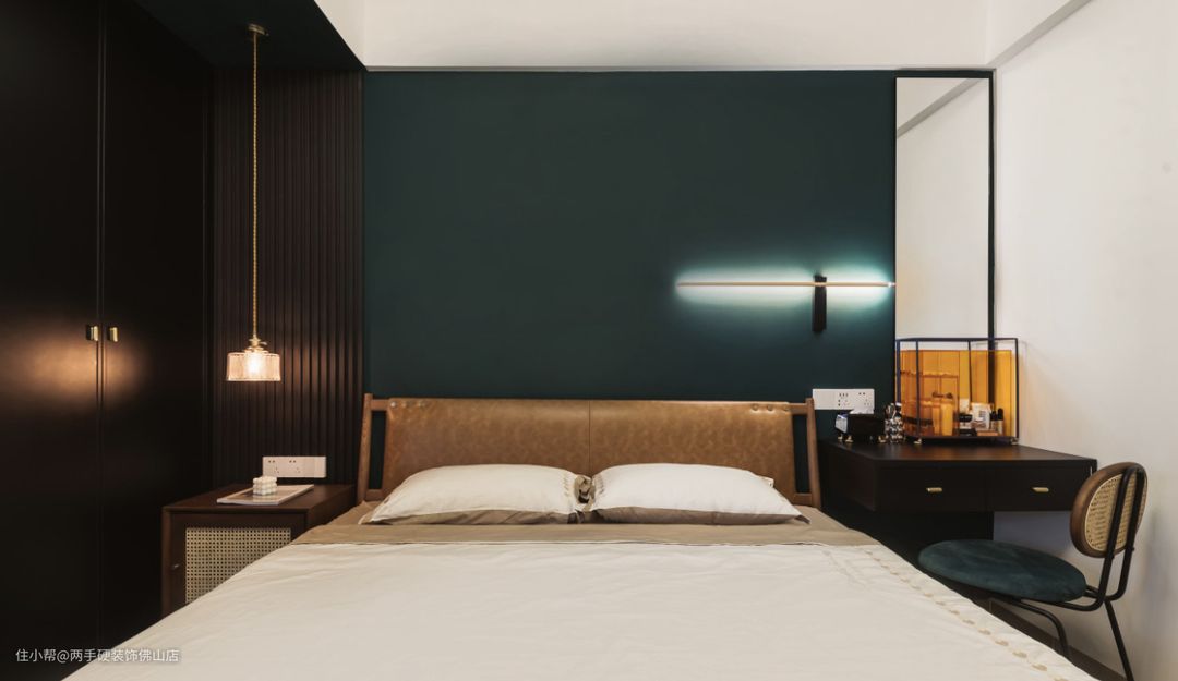 主卧床头背景墙与全屋色彩呼应,使用了墨绿色墙面搭配局部合适格栅。黑色衣柜和梳妆台搭配黄铜小拉手进行点缀。整体空间有质感且复古优雅但又不失时尚。