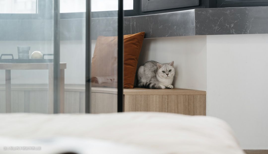 从卧室内看向阳台,趴在阳台卡座上的喵喵是家里成员之一。