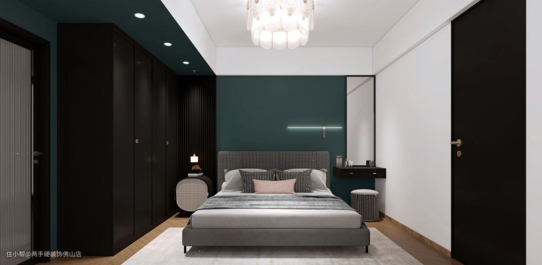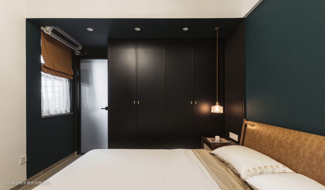 #主卧设计 衣柜区域从墙面到天花延伸了床头背景的墨绿色,黑色衣柜的高级质感也恰恰让卧室空间在视觉上得到了颜色。窗户旁边天花内暗藏空调挂机让空间更完美。主卫加高超白长虹玻璃门搭配黑锁,既能保证隐私,又可以给卧室增加几分采光,