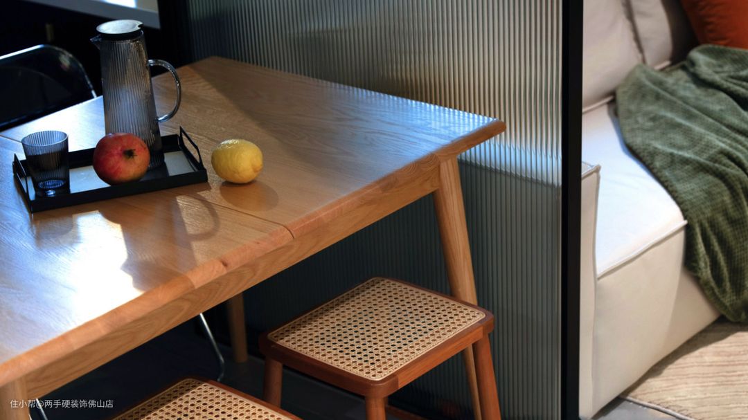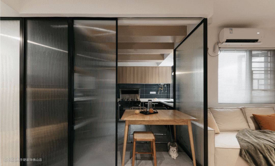 #餐厅设计 厨房打开状态三扇吊轨移门全部靠在进门左边墙面,厨房空间有限,因此在选择餐桌的时候特意挑选了可拉伸餐桌,原木色自然舒适与整体风格也很搭,平时1200*800,有客人来的可以将餐桌外移至公共区域展开,变成1500*800规格可以满足4~6人用餐。