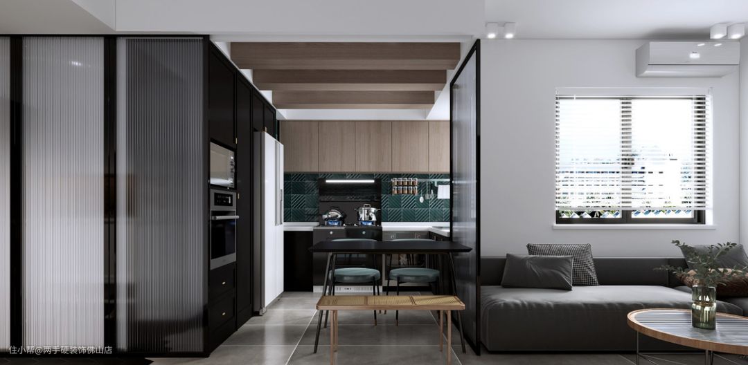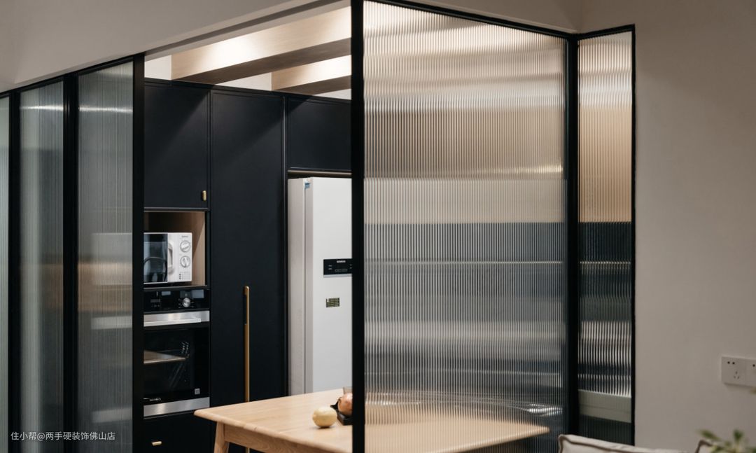 客厅方向看向厨房,厨房与客厅沙发之间用固定长虹玻璃作为隔断,既美观又透光。