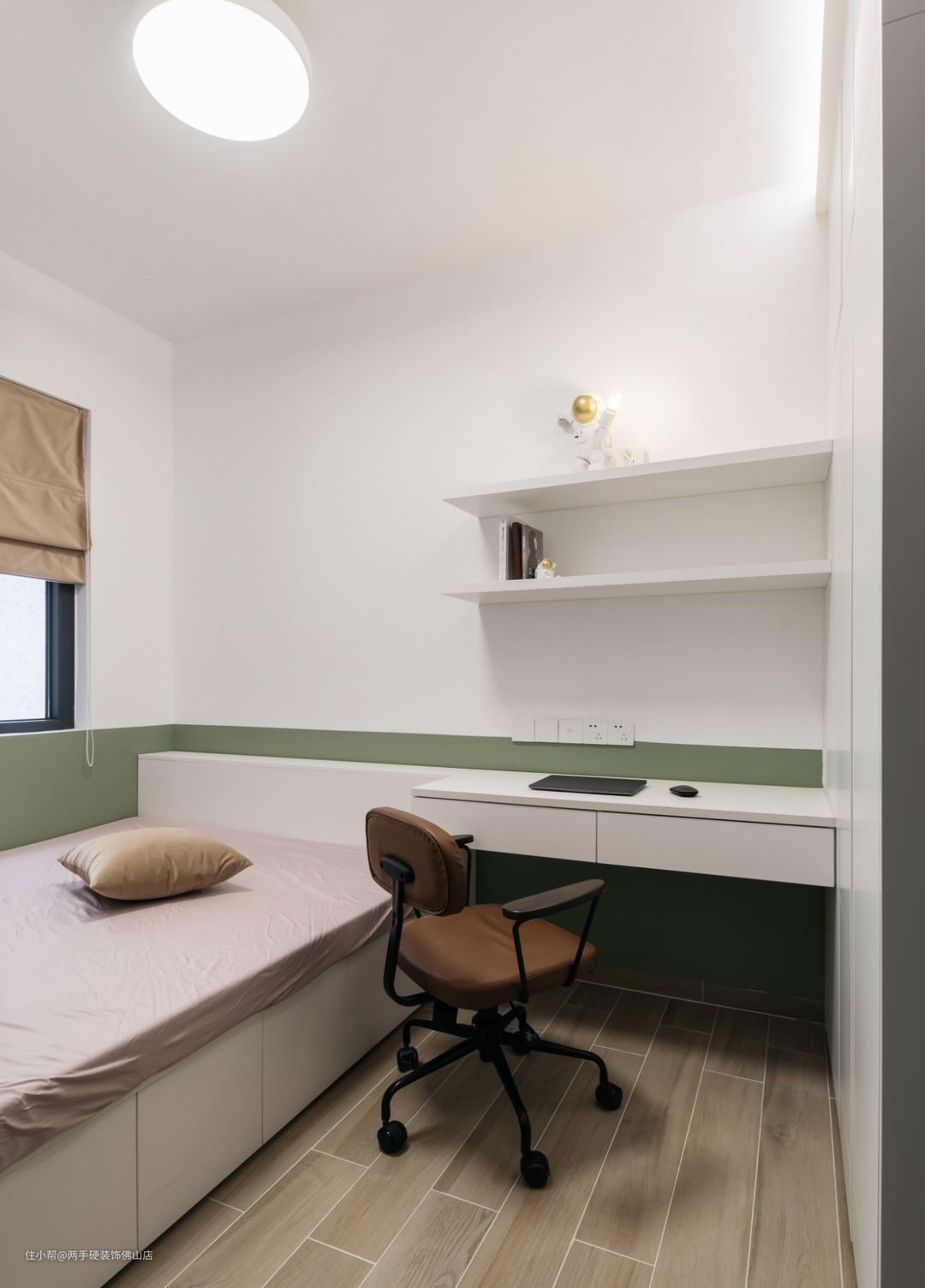 #书房设计 书房空间紧凑,且居住频率不高,将这个房间打造为集睡眠+书房为一体的多功能空间,定制的榻榻米内有足够的的空间安放换季衣服和被褥,同时方便家里有客人时临时居住,也方便将来有小朋友后长辈来照顾同住。紧靠榻榻米边上的写字台满足男主人偶尔办公需求。整体空间色彩是刷了半墙灰绿色墙漆,上半部分和全屋定制柜以白色位置,使小空间看起来更宽敞。榻榻米下方也设计了储物空间,换季衣物与被褥皆可收纳其中。