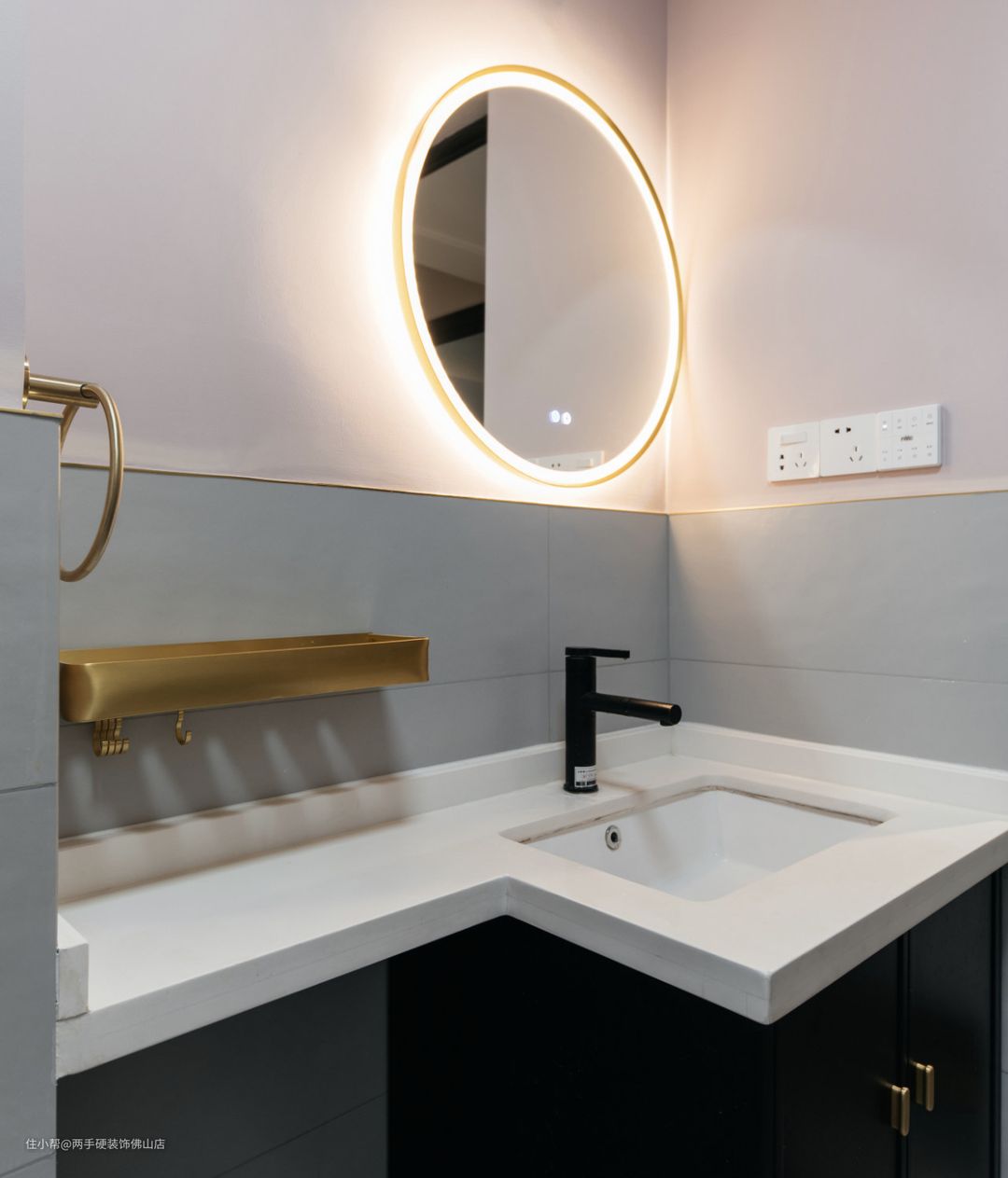做的洗手盆一体柜,延伸了台面,可以用来放置生活用品,做了圆形镜。
