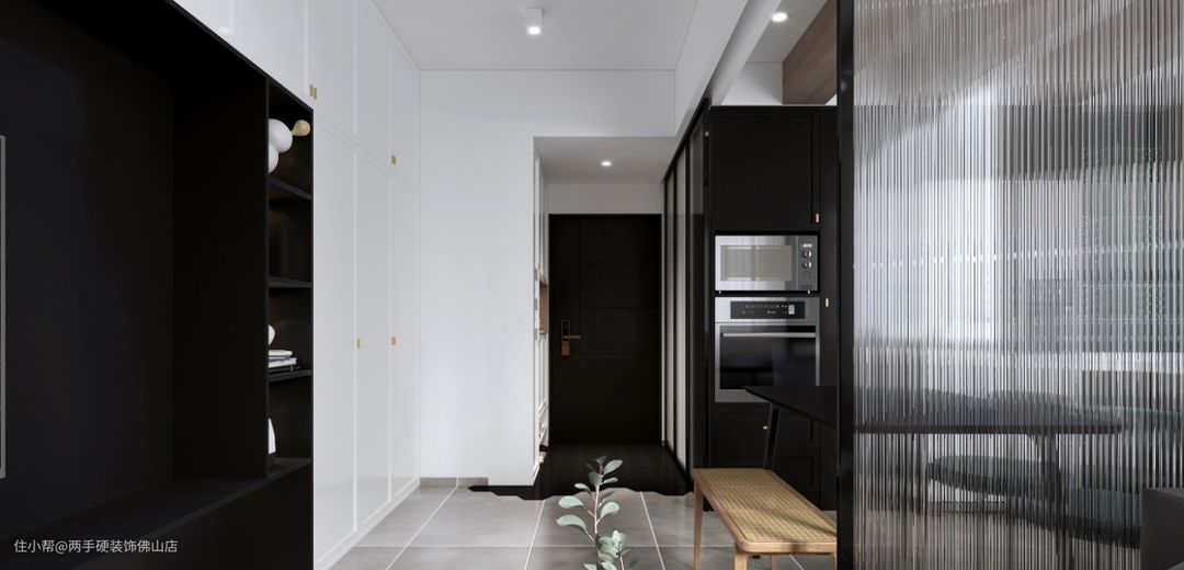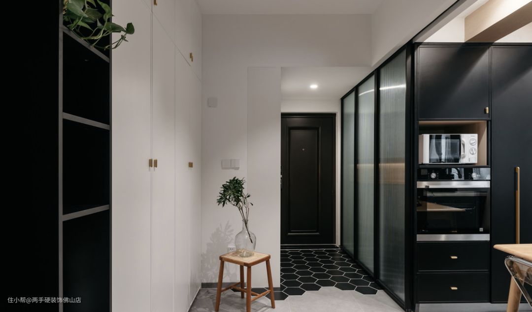 #入户玄关 入户玄关地面铺设纯黑色哑光六角砖进行分区,进门右手边设置储物鞋柜,选用白色柜门,在视觉上起到扩大空间的作用。