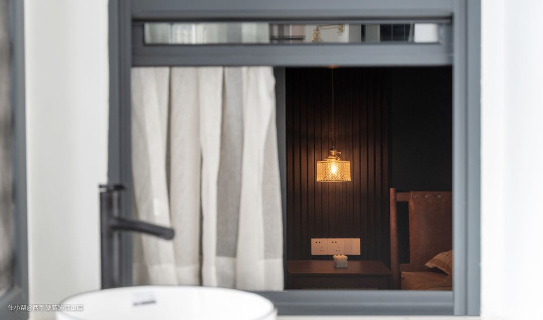 窗帘是一层棉麻纱帘加天鹅绒面材质的罗马卷帘,纱帘保证采光若隐若现,遮光帘彻底把室内外隔绝成两个世界,满足不同使用需求。