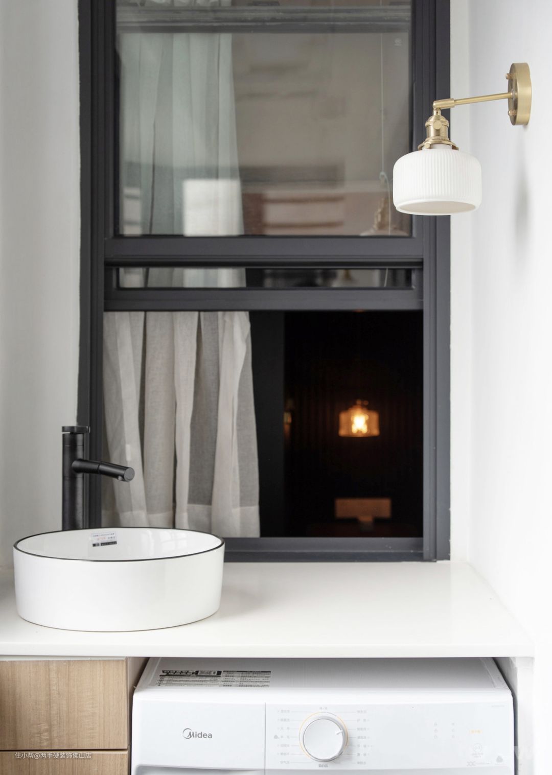 阳台空间有限,卡座的另一侧正好也是主卧窗户唯一采光位置,做了上提拉窗,平时可以打开通风,在窗户下面放置了洗衣烘干机和实用与美观并存的台上盆洗手池,方面清洗小件衣物。