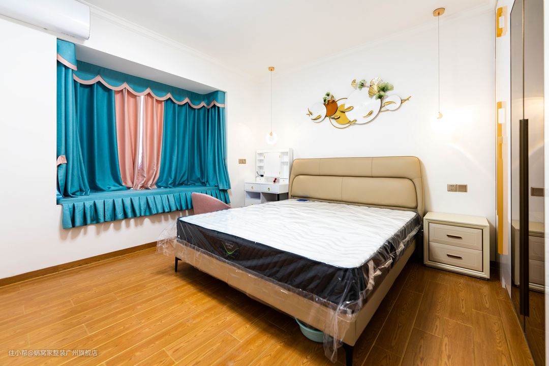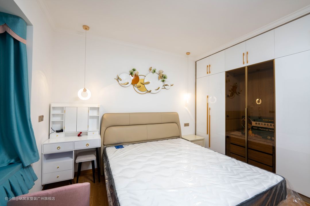 轻奢是一种生活方式,更是业主的品味凸显,看似简洁朴素的外表,却透漏出一丝“贵族”气息,强调现代与高贵的融合,也是轻奢最时髦的一种呈现方式了。简洁的空间,为主人带了的是轻奢舒适的惬意感。利落简洁的衣柜迎合着卧室暖意的主色调,大储藏空间确保了卧室的有序整洁。
