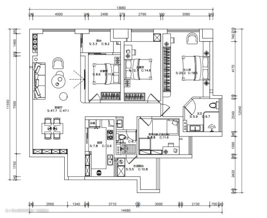 业主现状: 1.新房毛坯,家里常驻人口5人(夫妻,父母,女儿) 2.房子142平方 3.四房设计,注重生活品味 4.喜欢简简单单的设计,实用即可