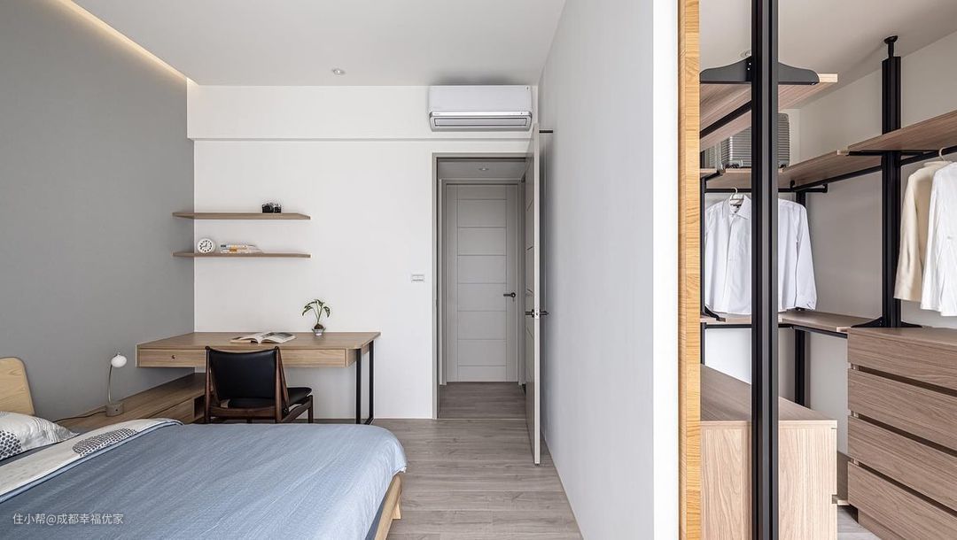主卧室地板木纹色系的引入,搭配上胡桃木床头柜,身处其中格外让人放松。深灰色窗帘和蓝白色床被相互呼应,增添主卧空间的关联性,在墙面设计了收纳用的置物空间与书桌。