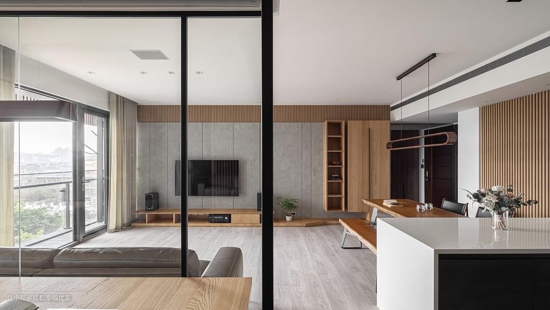 吊顶处理非常简单,与餐厅合并做双眼皮,安装中央空调,无主灯设计,环绕一圈做射灯进行照明。电视背景墙贴墙处理做了一排竖条木材组合墙,外装灰色石材拼接板,让墙面更有层次感,长形电视柜延展到墙尾,构成原木风背景墙。