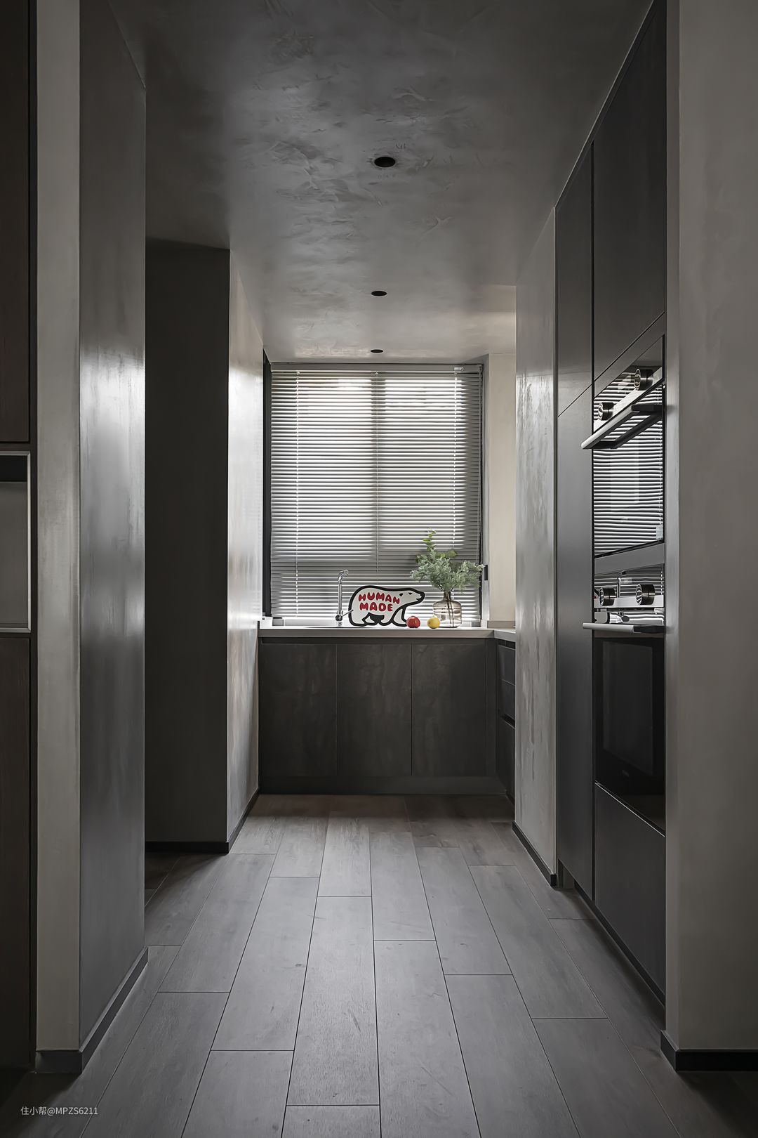 厨房延续整个空间的极致工业风格,深浅不一的微水泥打造无主灯的空间,其间错落着独断式的木质与铝合金吊柜体,操作台面则之下则打造深木质的底橱柜,充分满足空间的收纳需求,整体融合而统一,冷峻而保守。