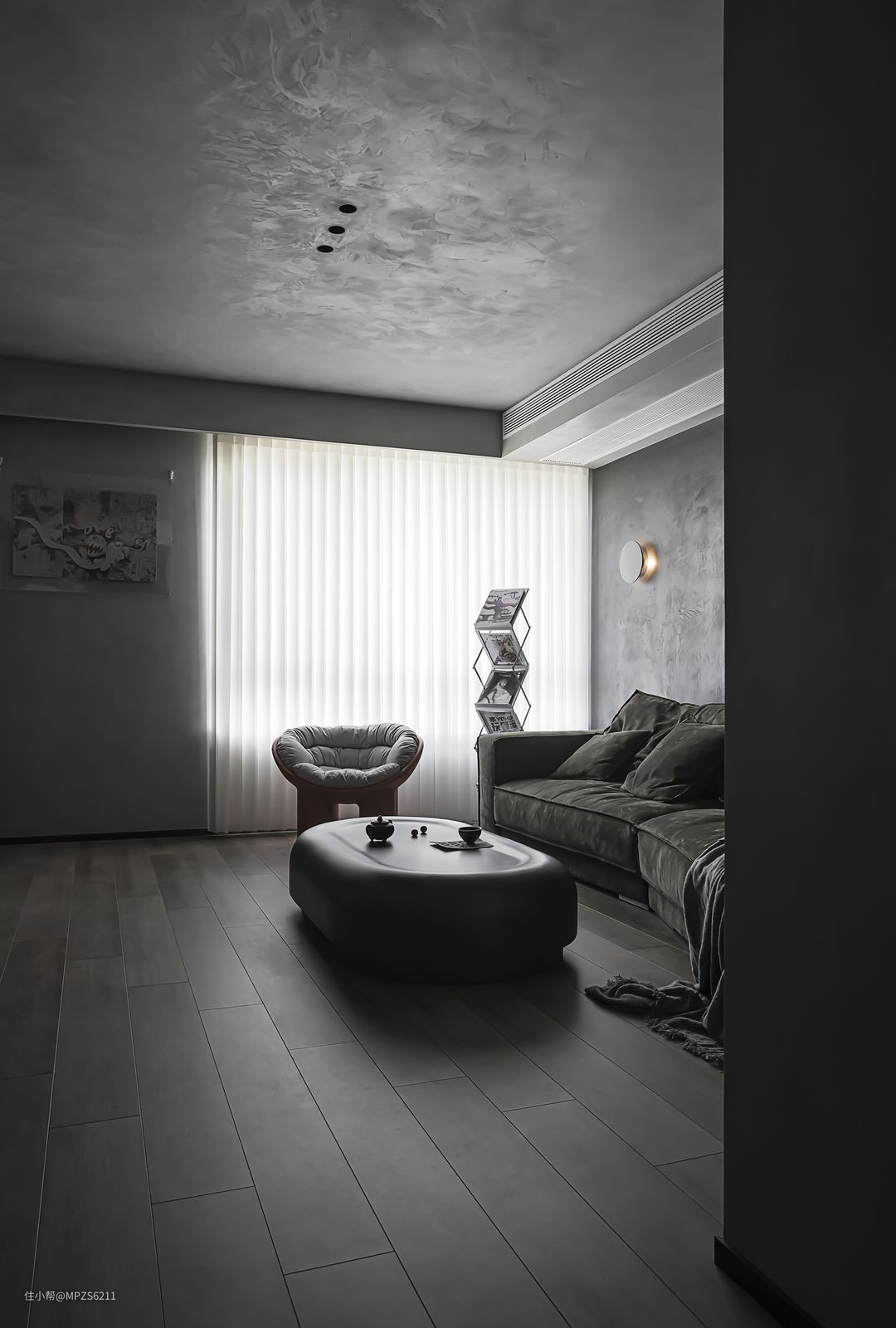 ▲设计亮点▲ ①客厅,从色彩、材质、光影上杂糅生活的气息,于无声中传达给居住者寂静欢喜的氛围; ②没有过多复杂的功能,灰与黑的明暗对比,虽简约,不简单,墙面运用微水泥,纹理质感强,光影效果好; ③悬浮电视背景轻易将空间层次递进,夹杂棕的柔和,绿的生机,折射出居住者喜爱寂静,却也有一颗柔软、热爱生活的心;