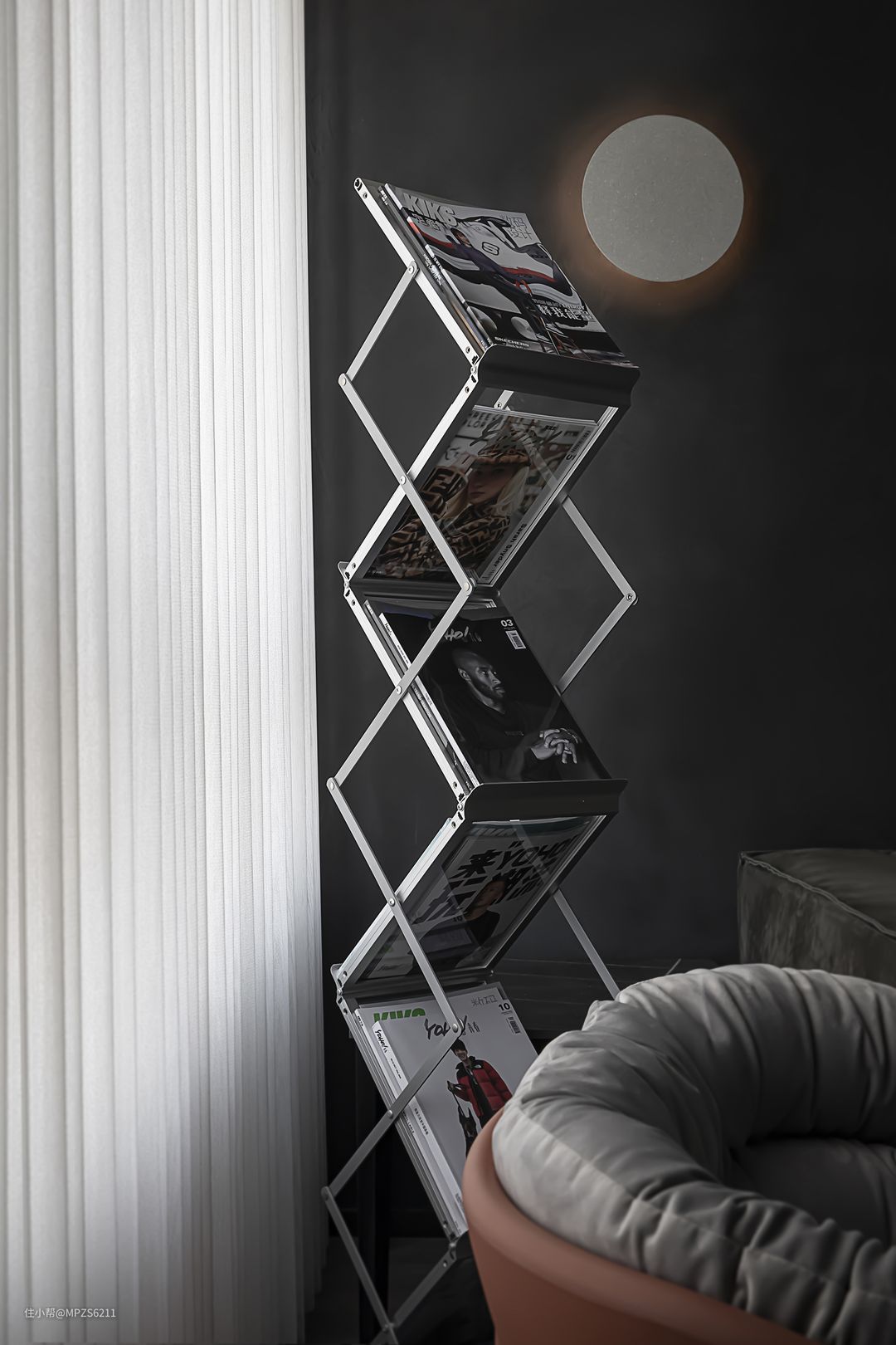 沙发背景墙贴近落地窗缘处,调设一盏白金调打造的壁灯,在整体的冷工业氛围下,注入一抹浅显得活力和趣味。