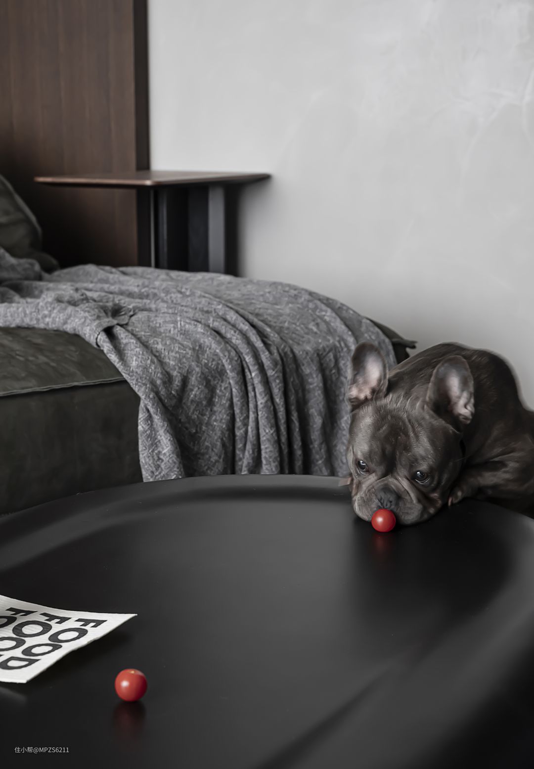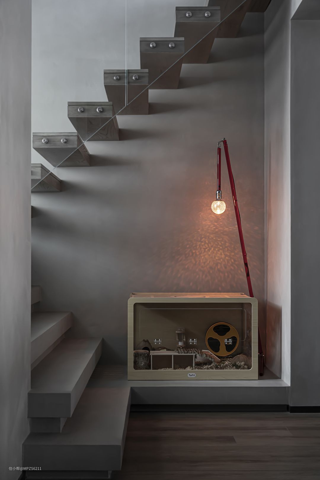 连结上下跃层的楼梯间则稍显温润,在一级地台的延伸角落,巧妙地布局宠物之家,用艳红线条垂拉暖光灯体,在整个灰黑调空间之中,打造小小的温馨之处。