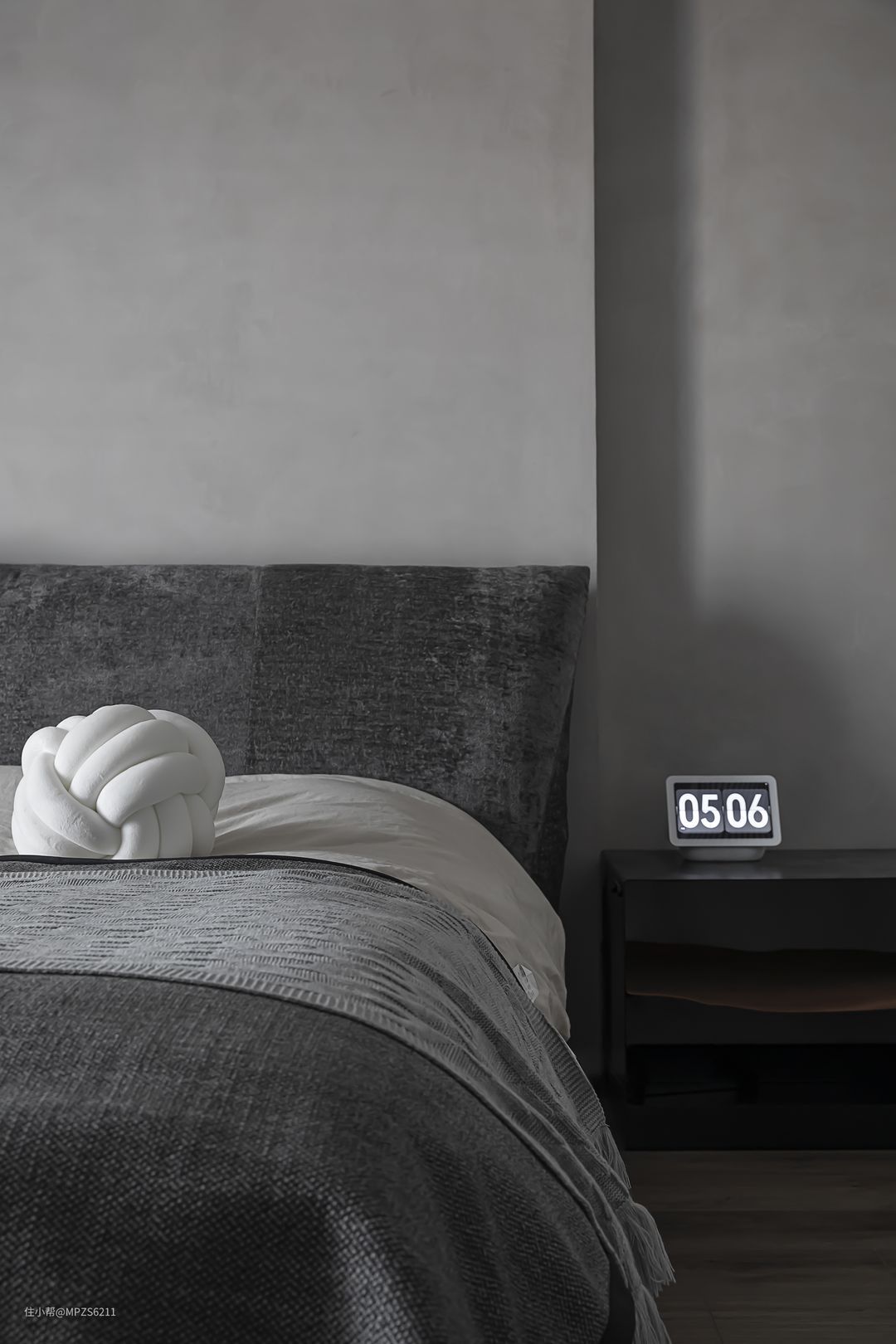 干净利落的床头背景墙侧定制一顶到柜的设计,无把手的推轨收纳柜门,与整体的空间协调统一,无过多修饰,在极简之中创造生活的格调。