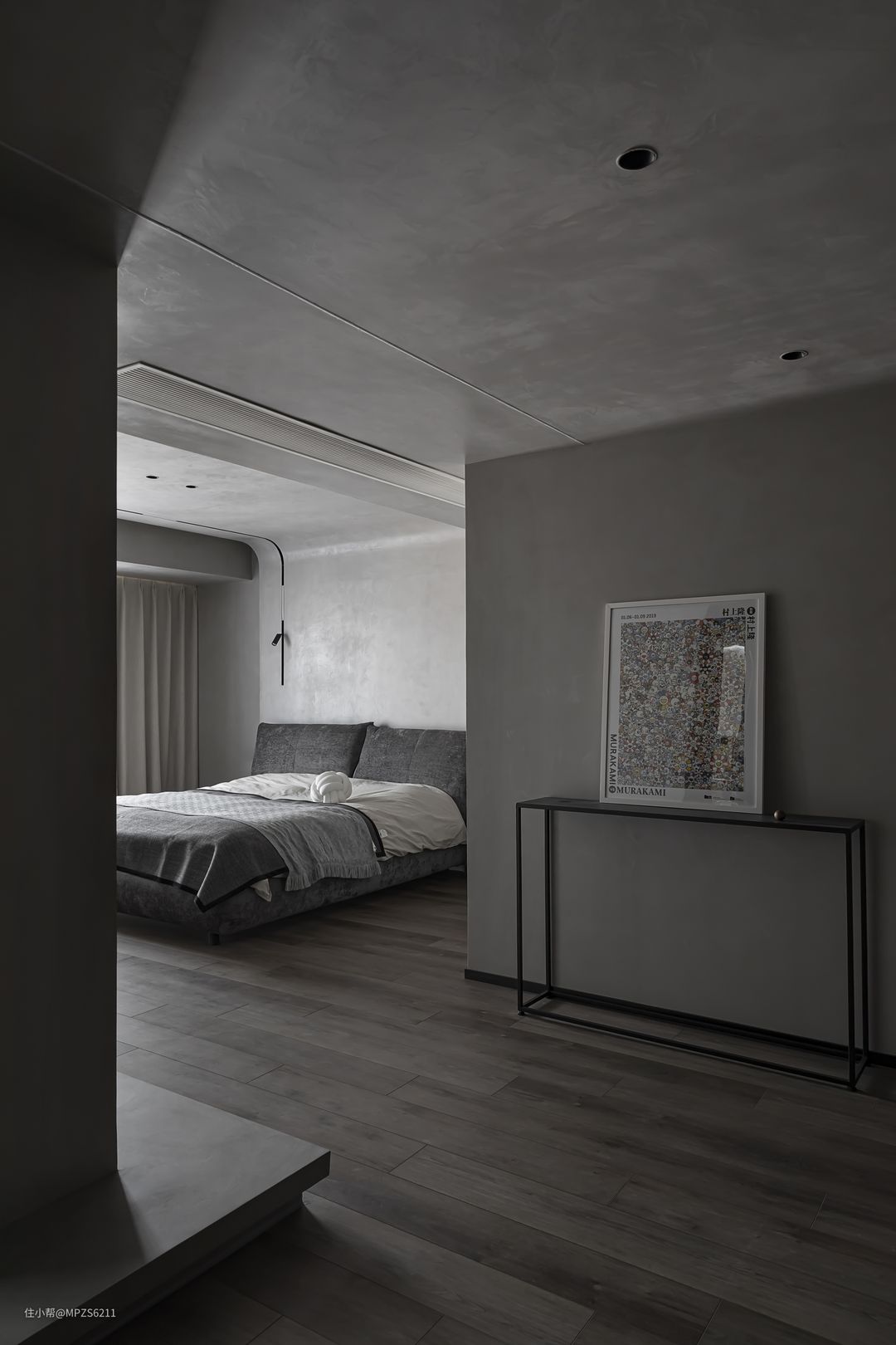 整个空间采用微水泥打造实体墙,一级吊顶做无主灯设计,布局黑线条框架联结的辅助灯带,不加任何花边修饰,没有矫揉造作的装饰,只有硬朗利落的线条,钢筋混凝土里伸展出的生命,虽柔弱却有自己坚韧的力量;在灰调空间中,工字拼木地板与棕木打造的实体竖墙融合之下,彰显极简与高级韵律。