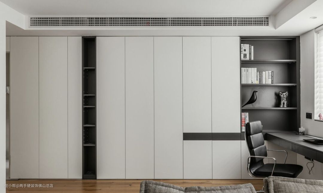 我们在顶部做了中央空调,书房这边的出风口做了加长处理,既增大了出风量,看着也特别整齐,跟顶部的线条搭配的毫无违和感。