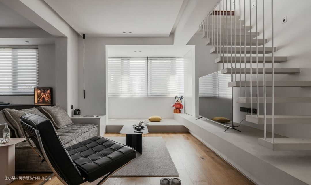 电视背景墙这边主要就是把原来三角形上方的厚重墙面变成留空的白色金属线条,减轻了空间的厚重感。这个通透的隔墙搭配上悬浮式的楼梯,空间的现代感和精致性一下增加了不少。