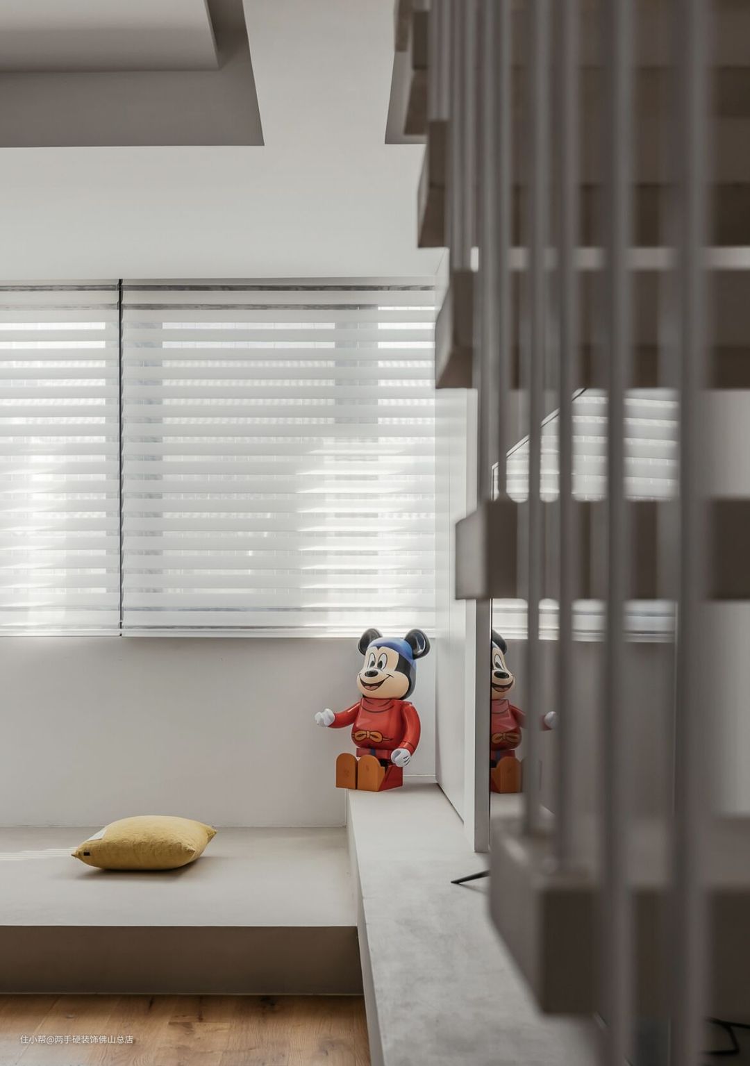 阳台上的这个手办是业主朋友送的新婚礼物,造型是米老鼠,色调上也比较鲜艳,正好给本来素简的空间注入一抹朝气。