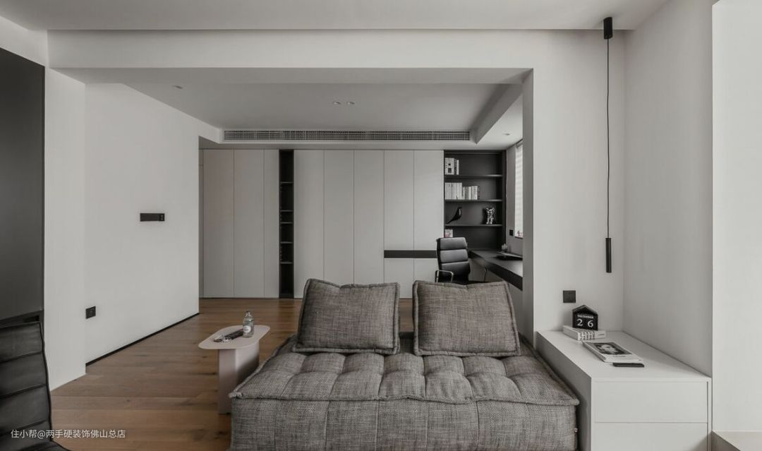 主卧打了一排高柜,放业主平时的衣物。空间出风口和隐藏筒灯都非常简洁,也是对极简风格的呼应。床具选了高级灰,跟整体色调成呼应。