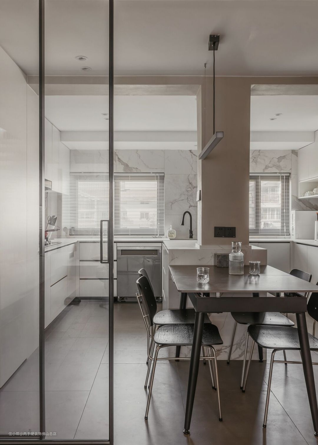 安装上轨道玻璃移门,避免油烟味散入客厅,对喜欢开放式厨房的人来说,简直就是救星。轨道放到上面,没有一般轨道门的累赘,还不影响空间的采光。